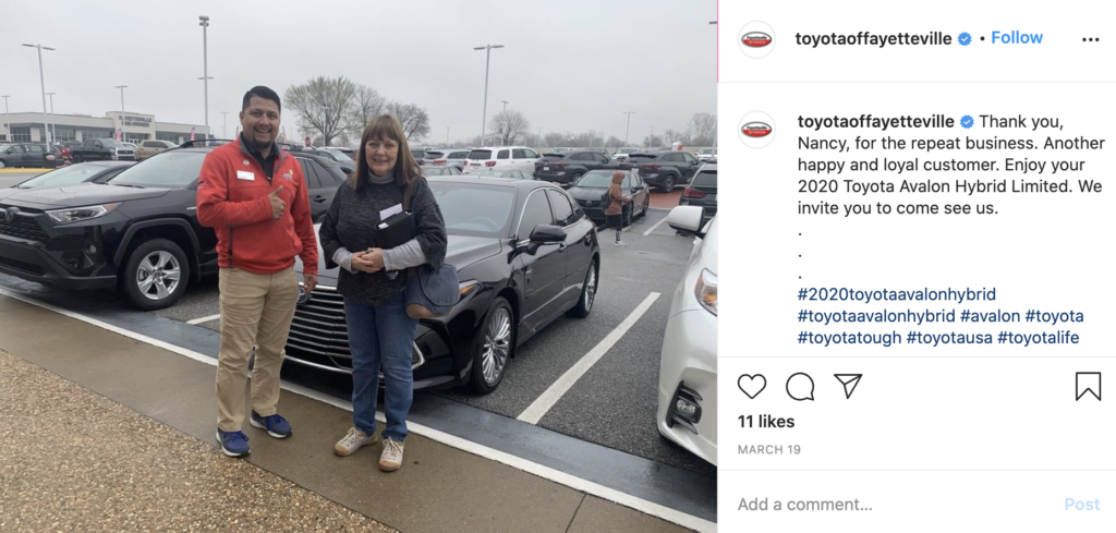 This is one of the most common automotive industry social media posts, but for good reason. When someone purchases a vehicle from your dealership, make sure to snap a pic of them smiling next to the vehicle to post on social media. People love to show off their new vehicles and they are very likely to share the photo with their own followers, causing a wave of jealousy that could very well send more prospects to your dealership. Always be sure to ask for permission to post their photo before you do!