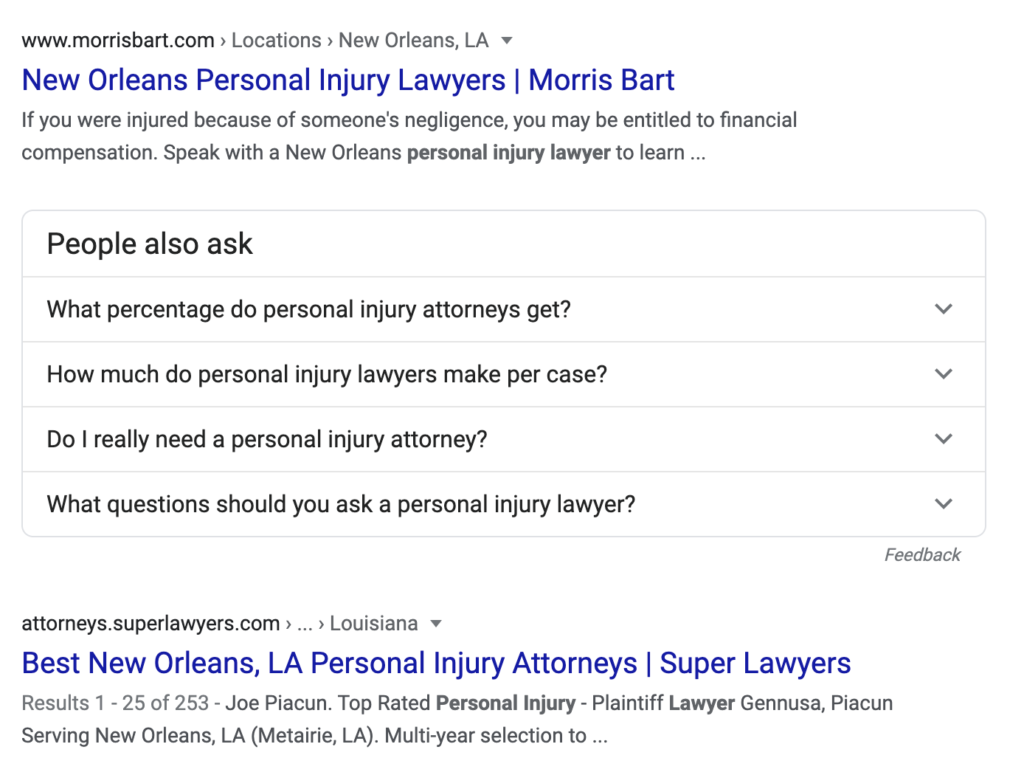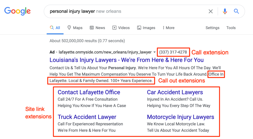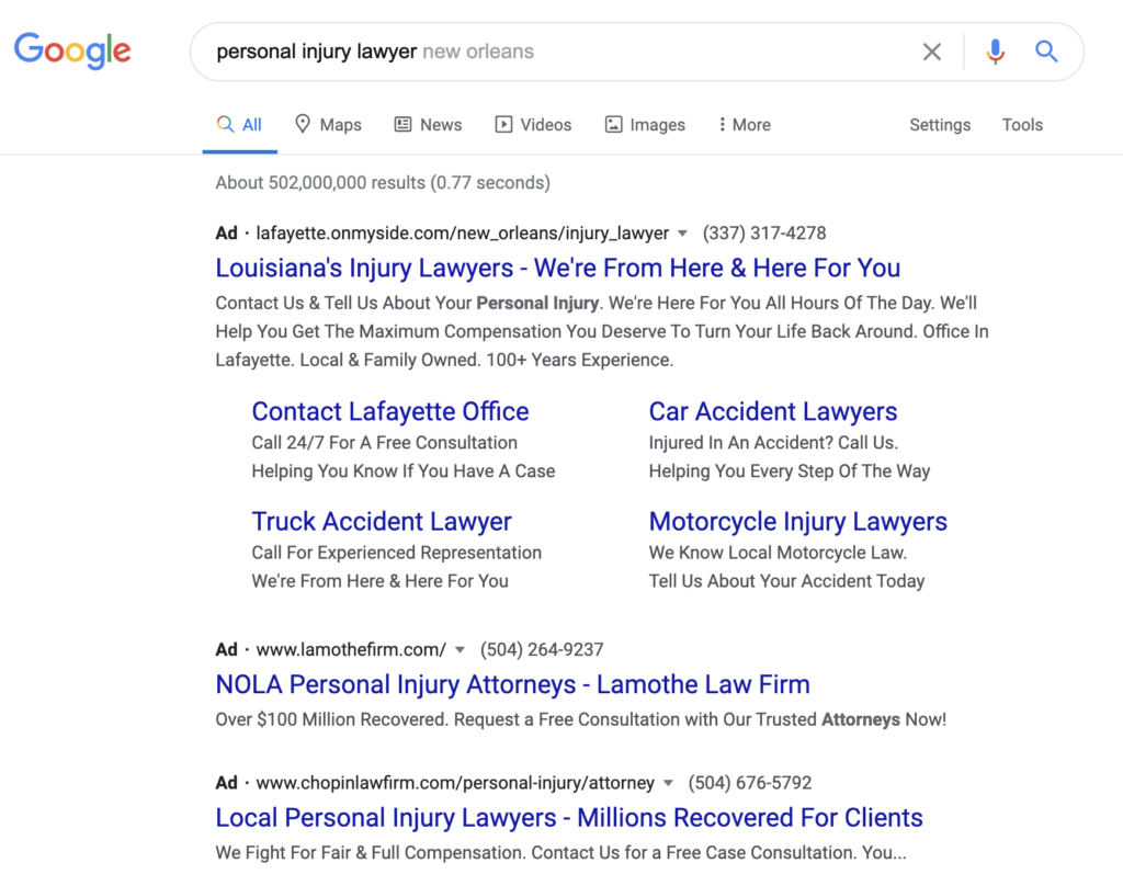 Google Ads is a popular form of PPC (pay-per-click) advertising for attorneys and law firms, and typically one of the largest expenses in a lawyer’s marketing budget. Using Google Ads, you can pay to have your advertisement appear above the organic results in searches for specific keywords.